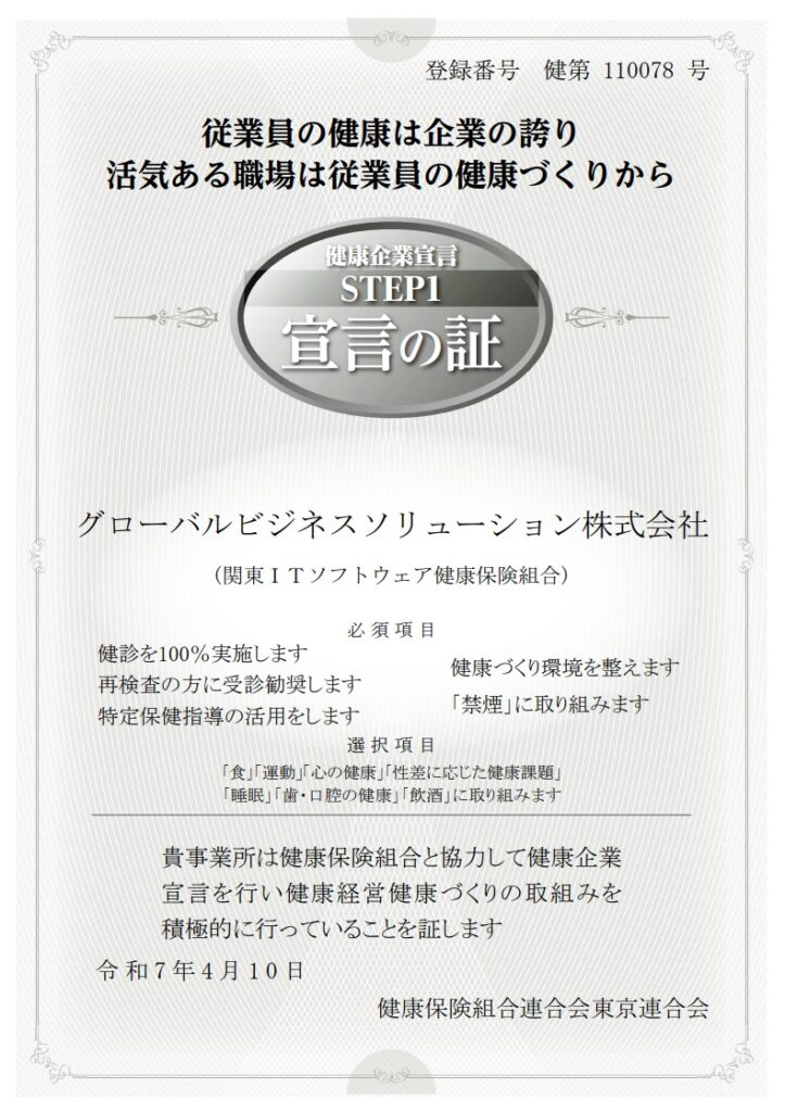 グローバルビジネスソリューション株式会社は、社員一人ひとりが心身ともに健康で、最大限のパフォーマンスを発揮できる環境づくりを目指し、健康保険組合連合会東京連合会に対し「健康企業宣言」を行ったことをお知らせいたします。